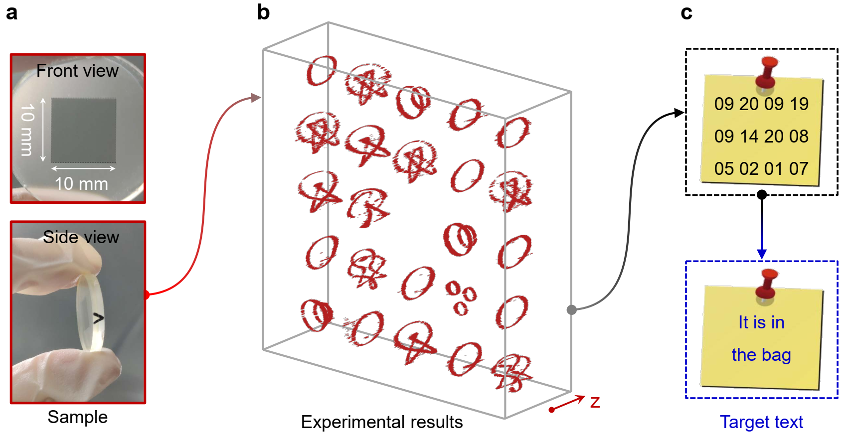 。”然后,构建拓扑全息图,并将其写入LC样品中,即实现了信息的存储过程(如图4a所示)。在信息读取过程中,首先测量LC样品后面衍射光场的强度分布,重建实验结果(如图4b所示);再计算每个拓扑结构的拓扑不变量,识别拓扑纽结结构类型;最后,将其转换为字母组合即可提取存储在样品中的信息“It is in the bag”(图4c)。