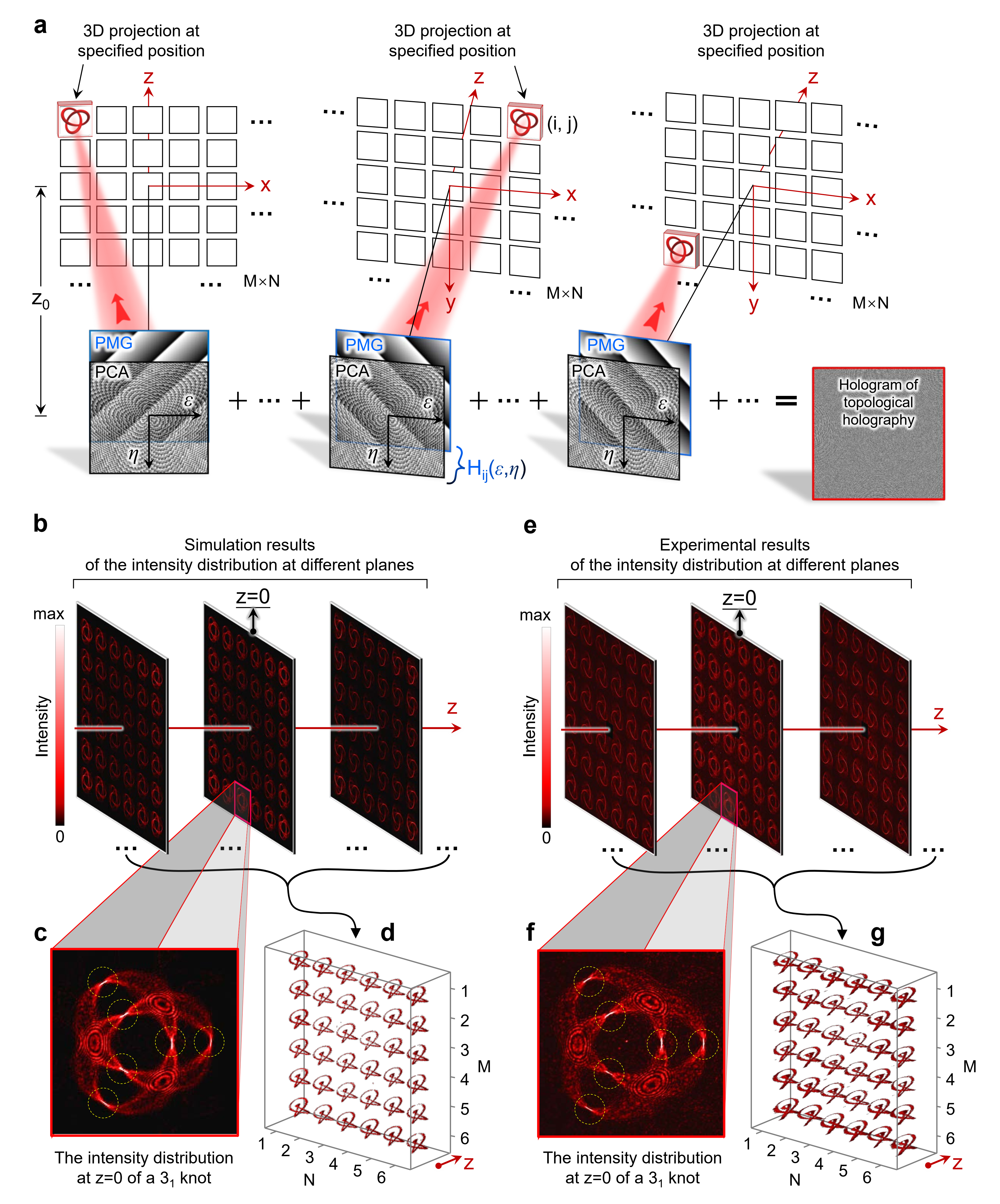 2019年,Ren等人,将轨道角动量自由度引入到全息技术中,通过生成空间阵列分布的轨道角动量态和基于轨道角动量态的强选择方法,实现了轨道角动量全息[Nat. Commun. 10, 2986 (2019); Nat. Photon. 14, 102 (2020)]。类似的,在本研究中,研究人员将拓扑纽结结构作为一种全新的三维自由度引入到全息技术中,通过生成三维空间阵列分布的拓扑纽结结构,实现了光拓扑全息,方案示意图如图1所示。首先设计能够生成三维光学拓扑纽结结构的全息图(PCA);然后设计不同的平移光栅(PMG),使得同一个三维纽结结构可以投影在不同的空间位置;最后,由所有的PCA和PMG集成而得到的一个全息图(Hologram of topological holography)即可用于生成一个三维纽结结构阵列。进而实现光学拓扑全息。图1(b, c, d)为理论结果,图1(e, f, g)为实验结果。