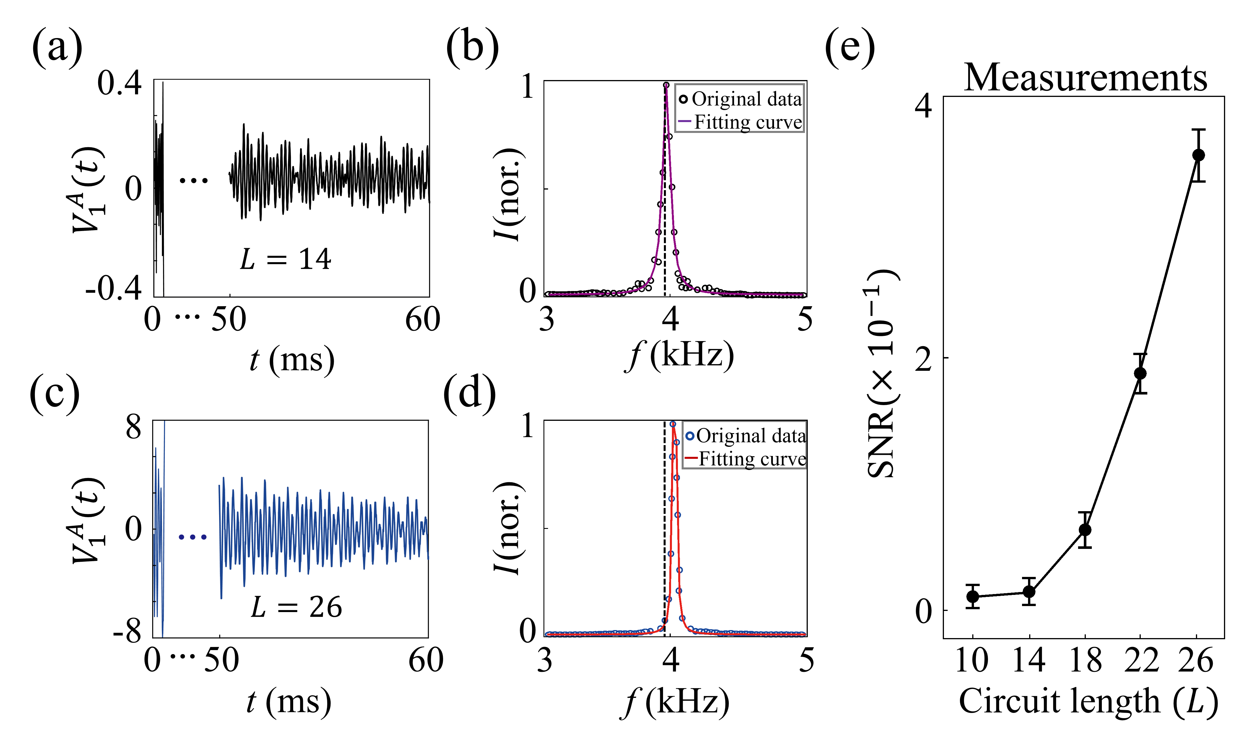 。图4(e)呈现长度L=10、14、18、22和26电路的实测SNR(每个样品独立测量35次,误差条表示波动范围)。实验数据明确显示:在相同噪声水平下,SNR随电路尺寸增大而提升。