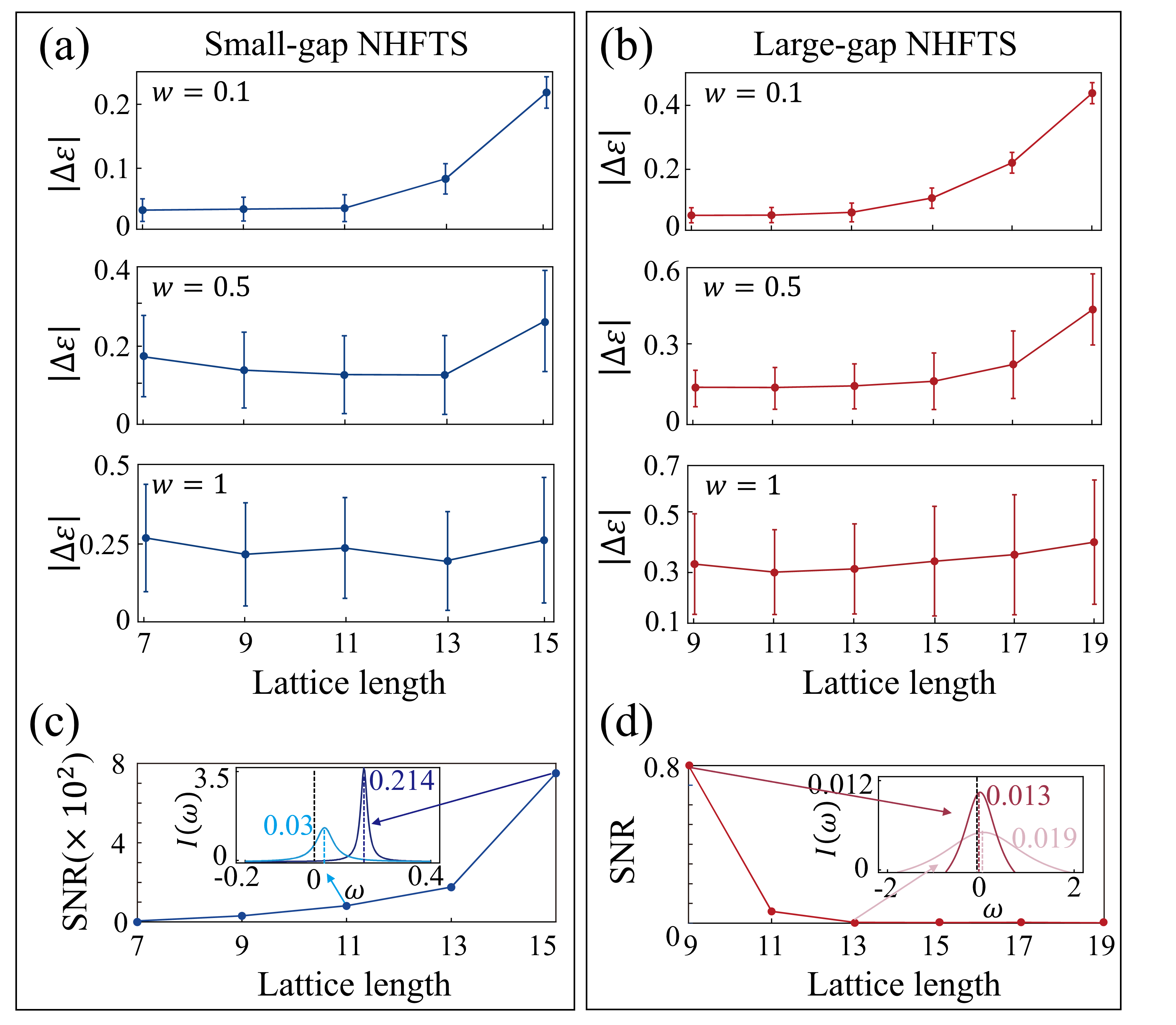 也必须随晶格长度增加而增大,以平衡增强的增益效应。这导致了非线性拓扑零能模的稳态振幅随晶格长度显著增加。稳态振幅的增加,反过来压制了损耗/增益子晶格在非线性拓扑零能态局域范围内产生的噪声影响,从而指数级提升了SNR。相比之下,宽带隙非厄米Floquet拓扑系统表现出截然不同的噪声响应特性:随着晶格尺寸增大,其SNR呈现下降趋势。该现象源于拓扑零模的空间局域化与噪音分布的不匹配特性:当损耗性B子晶格超出拓扑零模的局域化范围时,拓扑零能模无法有效抑制相应的噪声干扰。因此,实现SNR的指数级增强需要非厄米拓扑态与非线性饱和增益/线性损耗的空间分布相互匹配,已使得非厄米拓扑态的稳态振幅随晶格长度指数增加,并能同时压制由非厄米在位能产生的噪音影响。