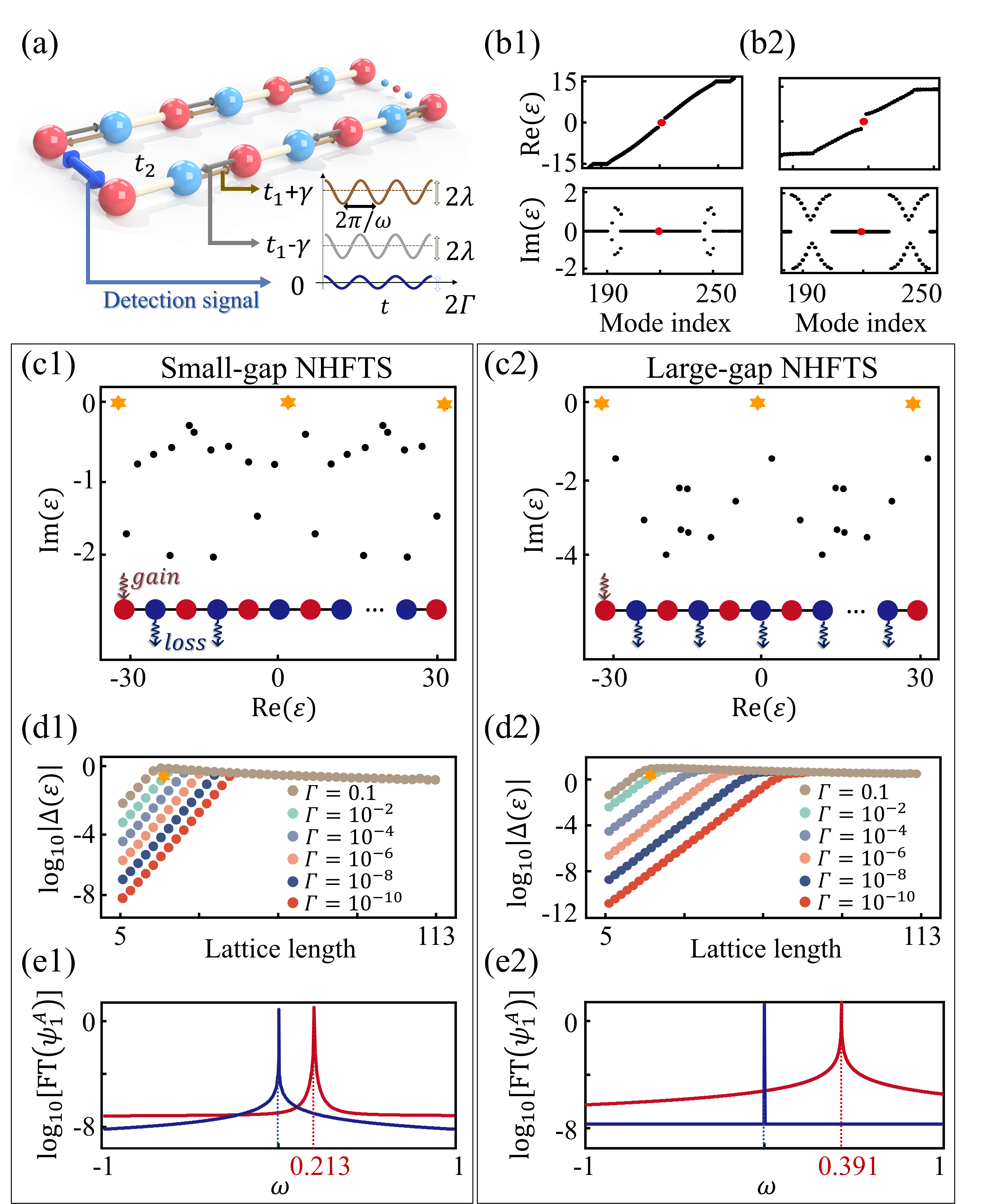 (蓝色线段)。图1(b1-b2)展示的是两个不同带隙宽度的非厄米Floquet拓扑系统的线性准能谱,其中Floquet拓扑零能模存在于带隙中。这两个系统连续能谱的本征值虚部均不为零,且窄带隙系统的平庸本征态的本征值虚部较小。这一现象使得许多平庸的特征模式具有更大的增益效应。因此,系统的演化是由这些平庸本征态的增益模式主导的,这使得Floquet拓扑零能模的能量移动较难被观察到。因此,为确保非厄米Floquet拓扑系统的可行性,所有平庸本征态的本征值虚部为负,而Floquet拓扑零能模的本征值虚部保持为零。