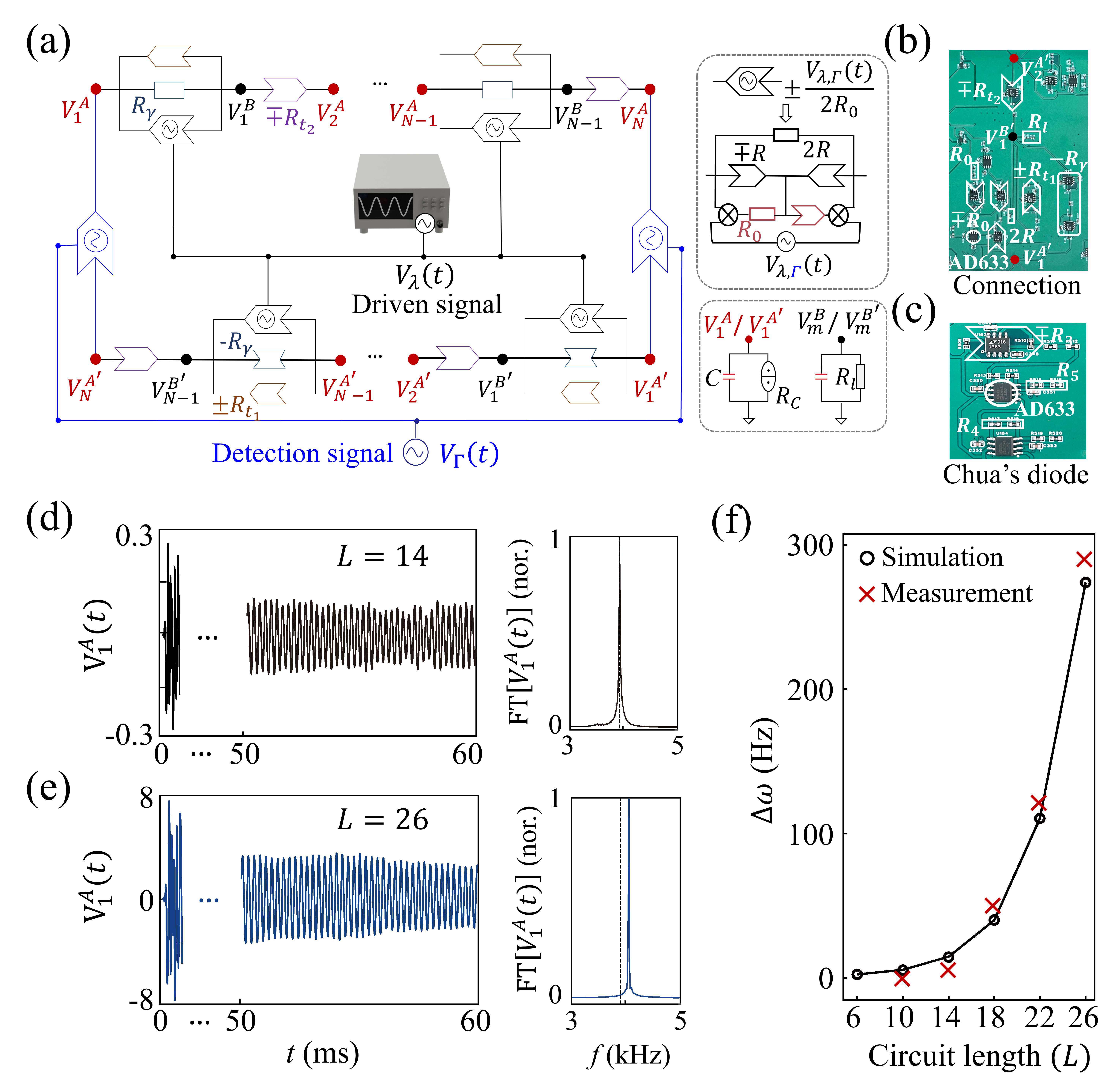 信号对应的傅里叶变换谱。实验研究发现,电路长度与频率偏移量存在显著相关性。如图3(f)所示,红色叉号标记了五种电路长度(L=10、14、18、22和26)对应的实测频率偏移量(