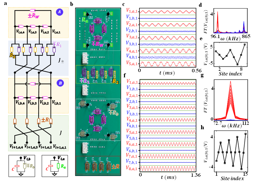 为了对上述理论预言进行实验证明,研究人员设计并制备了两种非厄米-非线性拓扑电路(图3a-3b和图4a-4b所示),使其电压动力学演化方程与图1a和2a中的耦合非线性振子模型的时域薛定谔方程在数学形式上完全一致。进而通过对电路电压演化特性的测量,实现了对上述非厄米趋肤全局同步(图3c-3h)以及非厄米拓扑全局同步(图4c-3h)的实验观测。