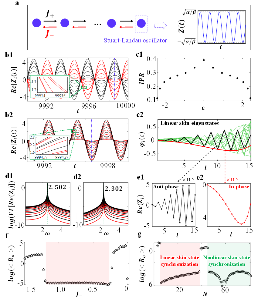 ,右侧插图展示了其自激振荡行为。研究人员对上百种随机初始条件下,系统的时域演化特性进行了计算。发现无论初始条件如何设置,系统都会演化到反相同步态或同相同步态之一,如图1(b1)和(b2)所示。通过稳定性分析可知,两种同步态都具有非线性稳定性,对应于非线性极限环。有趣的是,两种非线性同步态的空间分布(图1(e1)和1(e2))与Hatano-Nelson链的两个最小局域非厄米趋肤态(由IPR量化,图1(c1))的空间分布完全一致(归一化因子为11.5)。另外,反相和同相非线性同步态的频率(图1(d1)和1(d2))也与最小局域非厄米趋肤态的本征值相对应。这些结果显示,在弱非线性条件下 (β|Zl (t)|2≪J+,J-),系统可以展现由非厄米线性趋肤态统治的全局同步效应,即非厄米-线性全局趋肤同步。这一现象是由非厄米趋肤态的非正交性和非厄米趋肤极限环共同导致的。