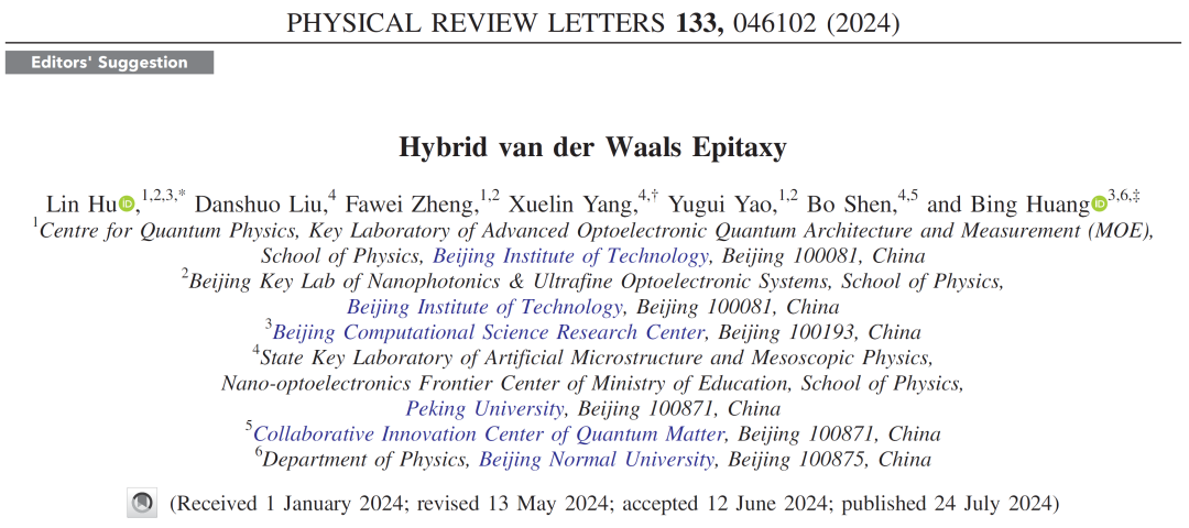 Lin Hu*, Danshuo Liu, Fawei Zheng, Xuelin Yang*, Yugui Yao, Bo Shen, and Bing Huang*. Hybrid van der Waals Epitaxy. Physical Review Letters, 133(4), 046102 (2024) (Editors’ Suggestion).