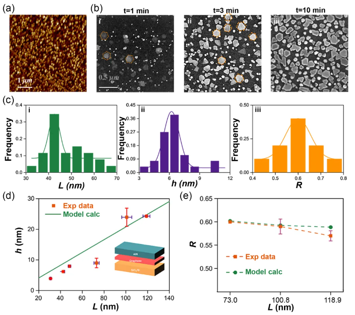 为揭开这一神秘的生长机制,研究团队以氮化铝薄膜生长在石墨烯上为例,利用多尺度的理论计算和连续介质模型推导,系统研究了氮化铝薄膜在平面内(图2)和垂直于平面方向(图3)生长动力学过程。有趣的是,他们发现氮化铝与石墨烯的界面存在一种新型的成键方式,即杂化范德华相互作用。这样一种独特的成键方式使得薄膜生长呈现出显著区别于传统模式的新范式,被命名为HVE模型。在HVE模型下,材料平面内和平面外的生长会较强的耦合在一起,并满足一定的物理约束条件,而这个约束条件也受到界面相互作用的影响。为了验证理论提出的这一新生长模型的可靠性,北京大学杨学林研究员等进行了实验验证,初步验证了该生长模式的可靠性(图4)。