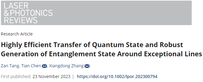 近日,必赢bwin官方网站张向东教授课题组设计非厄米量子行走,实现了高效量子态拓扑调控。相关成果以“Highly Efficient Transfer of Quantum State and Robust Generation of Entanglement State Around Exceptional Lines”为题发表在Laser & Photonics Reviews 期刊[Laser Photonics Rev. 2023, 2300794]上。该研究工作得到了国家自然科学基金委的大力支持。必赢bwin官方网站汤赞博士、陈天副教授为该论文的共同第一作者,必赢bwin官方网站陈天副教授、张向东教授为论文共同通讯作者。