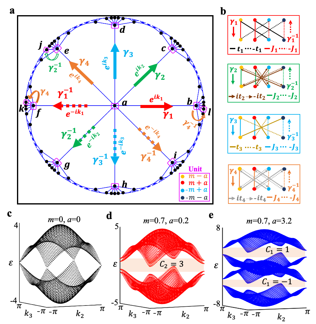 研究人员考虑具有{8,8}布拉维晶格的双曲模型,其具有四维动量空间的性质,如图1a所示。原包内部的四个子格点具有不同的在位能。沿着四个动量方向的包间耦合显示在图1b中。图1c-1e展示了不同在位能下,双曲晶格模型的能带结构(k1=k4=0)和拓扑不变量。可以看到通过调节在位能的大小,双曲能带从半金属态(图1c)过渡到具有非零二阶陈数(图1d)和非零陈数(图1e)的双曲拓扑态。