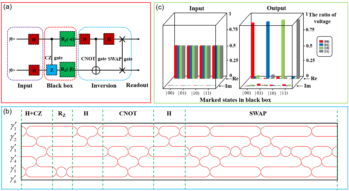 在能够操控零能模展示单比特门和两比特门的基础上,研究人员通过操控更加复杂的零能模编织过程,从而实现Grover搜索算法的功能。如图5(a)和5(b)所示,研究人员通过操控6个零能模式的顺序编织过程,从而演示了两比特Grover搜索的功能。在电路实现中,研究人员使用五个T型结来构建三对(6个)零能模式。通过调节绿色耦合的开关,实现了边缘态的编织功能。按照图5(b)中所展示编织顺序,从而完成了整个搜索过程。