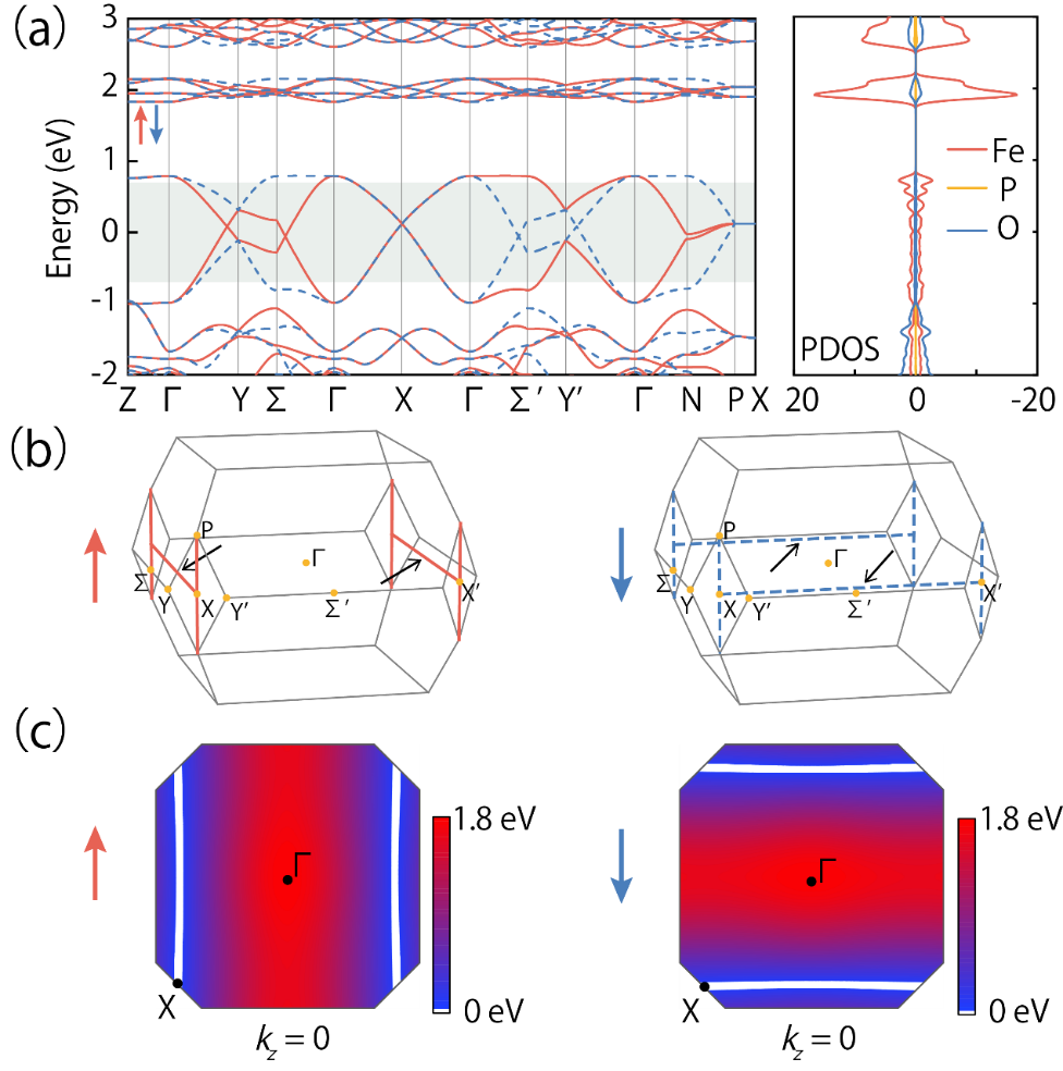 图3 (a) β-Fe2(PO4)O的能带结构和投影态密度。绿色高亮区域表示Z3交错磁性的节线网出现的能量区间。(b) 上自旋和下自旋通道中Z3交叉节线的形状。这两条Z3交叉节线形成了一个Z3节线网。(c) 在 kz = 0 平面上,上下自旋通道的Z3节线形状,如 (b) 中的箭头所示。
