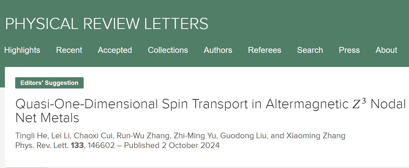 Tingli He,# Lei Li,# Chaoxi Cui, Run-Wu Zhang, Zhi-Ming Yu,* Guodong Liu, and Xiaoming Zhang*; “Quasi-One-Dimensional Spin Transport in Altermagnetic Z3 Nodal Net Metals”, Physical Review Letters 133, 146602 (2024).