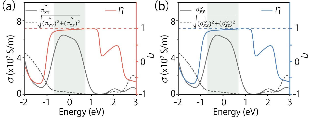 图4 在(a)上自旋和(b)下自旋通道中 β-Fe2(PO4)O化合物的电子电导率(左轴)和(右轴)。绿色阴影为交错磁性的Z3节线网出现的区域。
