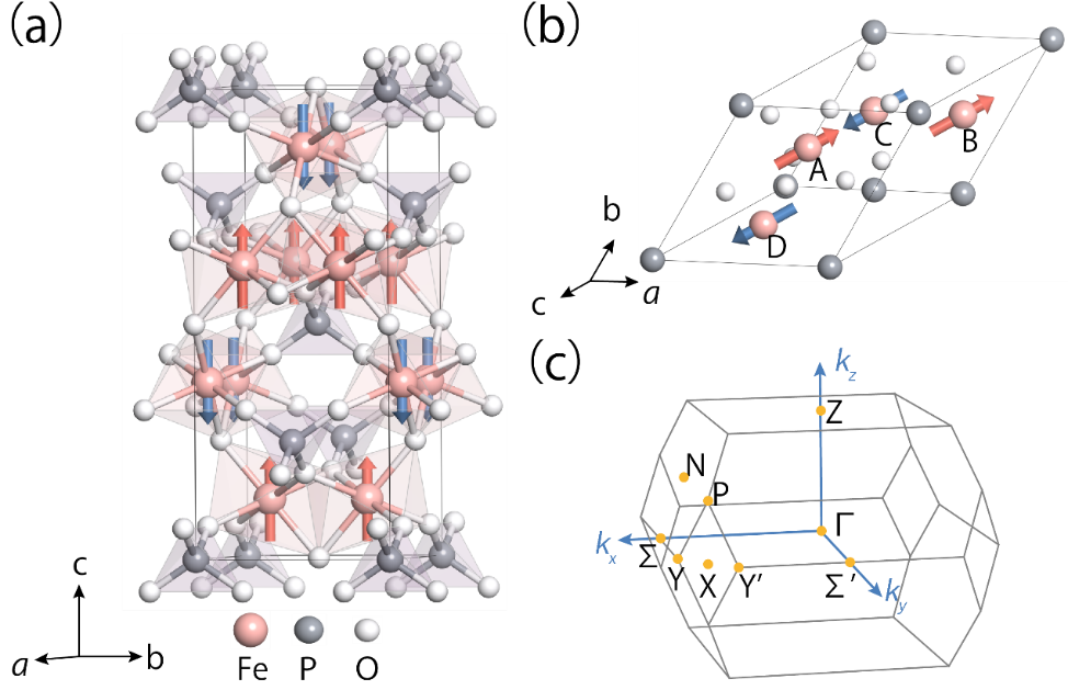 图2 (a) β-Fe2(PO4)O 的晶胞和 (b) 原胞。红色和蓝色箭头分别表示上自旋和下自旋的磁矩。(c) 表示布里渊区。