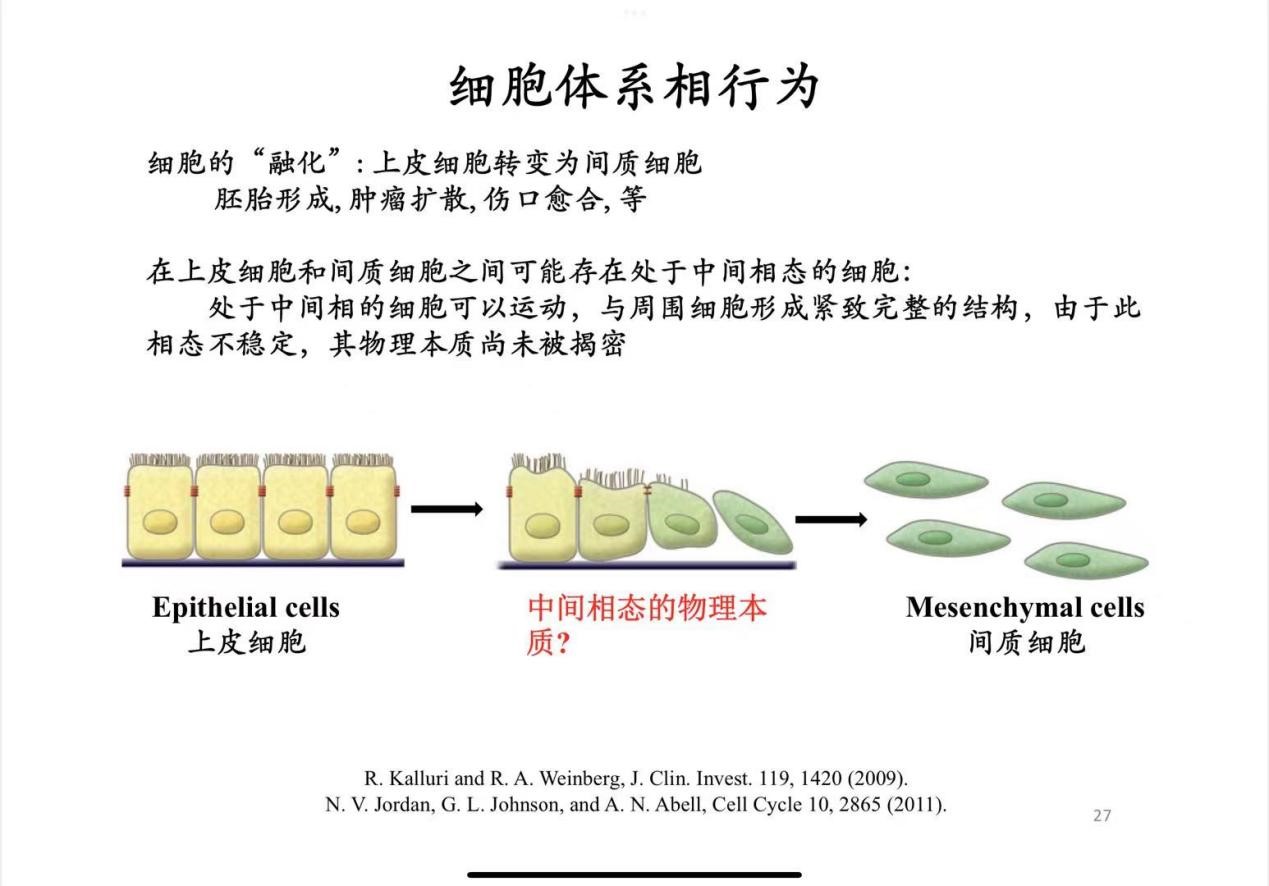 在生物学领域,李艳伟老师也有突出的学术成果,通过类比二维熔化机理的相关研究,建立了细胞体系的相图,预测了二维细胞体系可能存在中间相,即六角相,为研究细胞的运动,演化提供了物理基础。