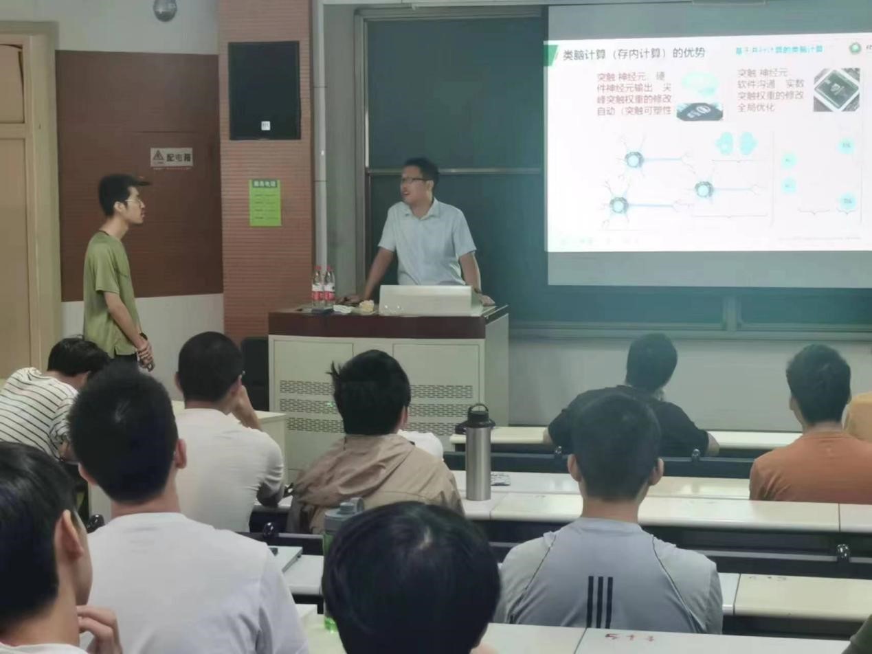 在讲座中,孙教授先向我们介绍了当前计算机算力发展受阻的现状:当前人工智能算力的发展瓶颈和摩尔定律的限制,需要对计算机的架构进行根本性的改变;提出了重新设计类脑器件以提升算力的构想,围绕现有的神经拟态器件的物理机制展开介绍;接着向我们介绍了“忆阻器”这一新式硬件,说明以忆阻器为载体实现存储与计算融合为突破传统“冯诺依曼”架构提供了有效的解决方案。但由于材料本身以及器件工作机理的限制,忆阻器尺寸微缩难以继续。孙教授在此基础上详细讲述了他的科研项目:利用具有层状超薄特性和丰富的物理电子特性新型低维材料,通过合成/堆叠异质结来制造新型忆阻器,实现新型信息电子器件在类脑计算上的应用。