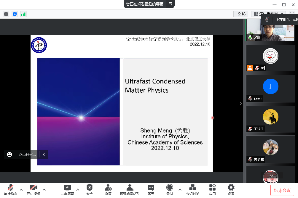 2022年12月10日上午,中科院物理所孟胜研究员受邀给我校必赢bwin官方网站老师和研究生做了题为“超快凝聚态物理”的报告。该报告是“21世纪学科前沿”系列学术报告之一,受到了必赢bwin官方网站广大师生的欢迎。