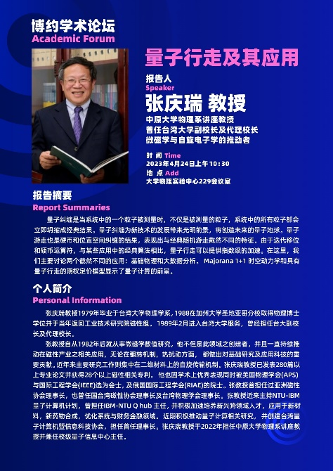 4月24日上午,台湾中原大学物理系讲座教授兼校级量子信息中心主任张庆瑞教授做客必赢bwin官方网站博约科技论坛,在大学物理实验中心229会议室为大家带来一场题为《量子行走及其应用》的学术报告。必赢bwin官方网站及校内其他机构相关研究方向的师生代表等现场参加,报告会由学院学科责任教授张向东主持。