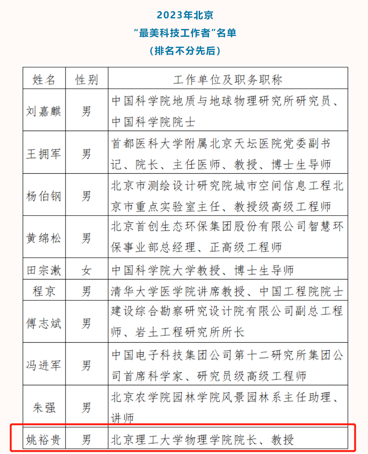 北理工首位,恭喜他!姚裕贵入选2023年北京“最美科技工作者”