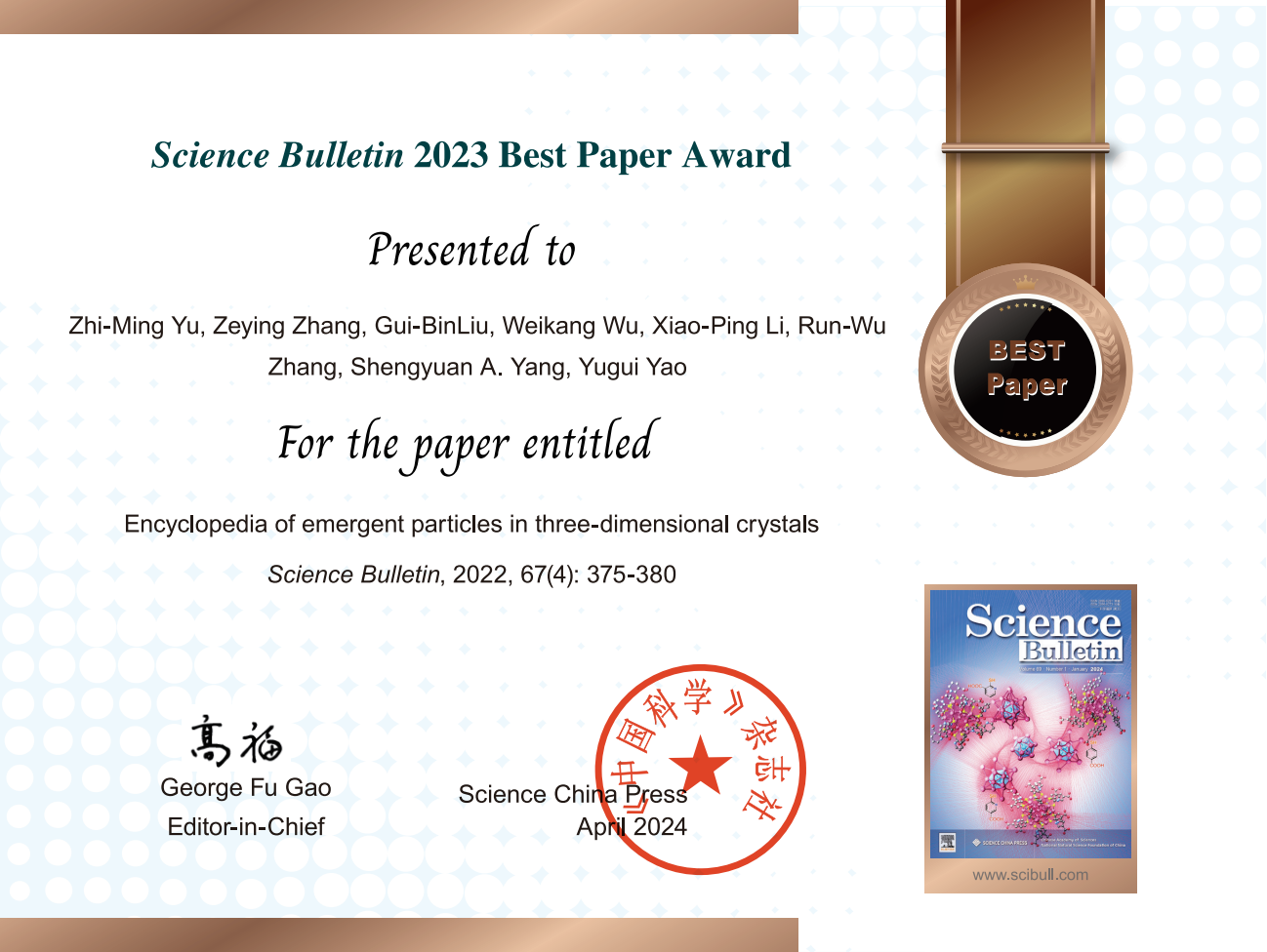 日前,《科学通报》(英文版, Science Bulletin )公布了2023年度高影响力论文评选结果。必赢bwin官方网站姚裕贵教授课题组署名论文《三维晶体中的演生粒子百科全书》【Encyclopedia of emergent particles in three-dimensional crystals; Science Bulletin 67 (2022) 375–380】入选年度“2023 Best Paper Award”。该论文必赢bwin官方网站为第一完成单位,必赢bwin官方网站余智明教授和北京化工大学张泽英副教授为共同第一作者,必赢bwin官方网站姚裕贵教授为唯一通讯作者。必赢bwin官方网站刘贵斌副教授和新加坡科技设计大学杨声远教授(现任职于澳门大学)等人对该项研究也有重要贡献。