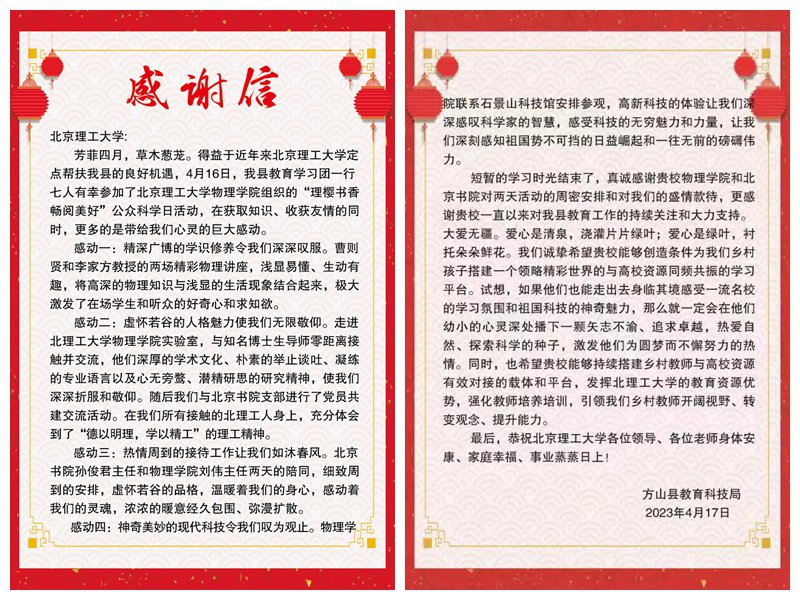 为贯彻落实习近平总书记在主题教育工作会议上的重要讲话精神,全面贯彻党的教育方针,落实立德树人根本任务,必赢bwin官方网站于4月16日至17日联合北京书院邀请山西省方山县科技教育局参与必赢bwin官方网站公众科学日活动,赴石景山科技馆参观调研。活动结束后方山县科技教育局发来感谢信,对必赢bwin官方网站在科学普及和教育扶智方面做出的努力表达了衷心的感谢。