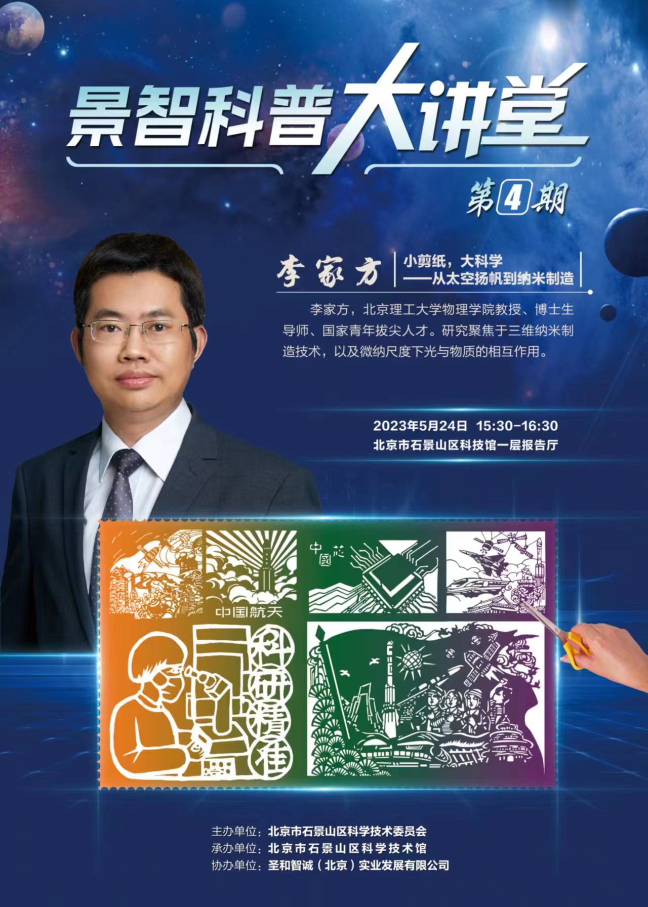 一把剪刀,一张薄纸,大千世界就可以跃然纸上。北理工必赢bwin官方网站副院长、国家青年拔尖人才李家方教授聚焦三维纳米制造“卡脖子”技术难题,2018年在国际上首次实现了纳米剪纸三维微纳制造技术,该系列研究受邀参与国际会议报告10余次,并受邀参与央视节目录制。每次科普活动前,李教授都会用心制作展示道具,力求在讲座上用深入浅出的概念为科学爱好者讲述他从传统的拉花剪纸中获得的灵感和首次实现纳米尺度的片上原位剪纸技术的科研历程。