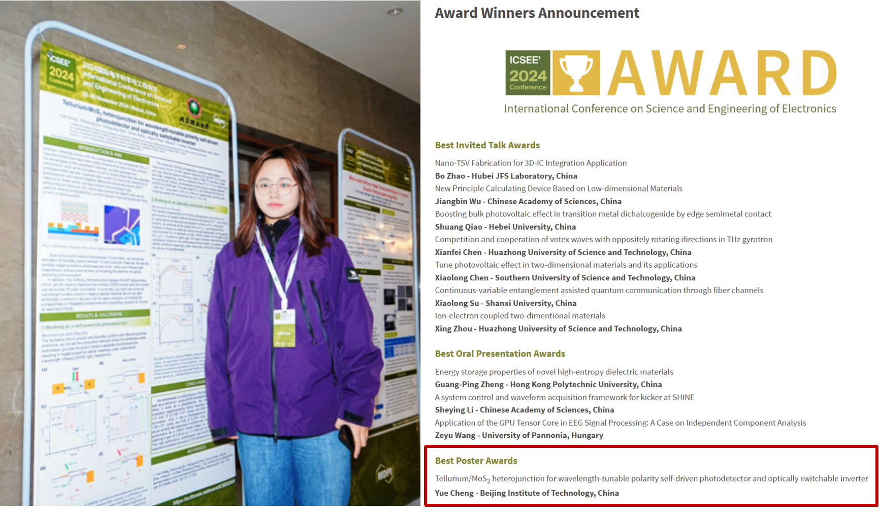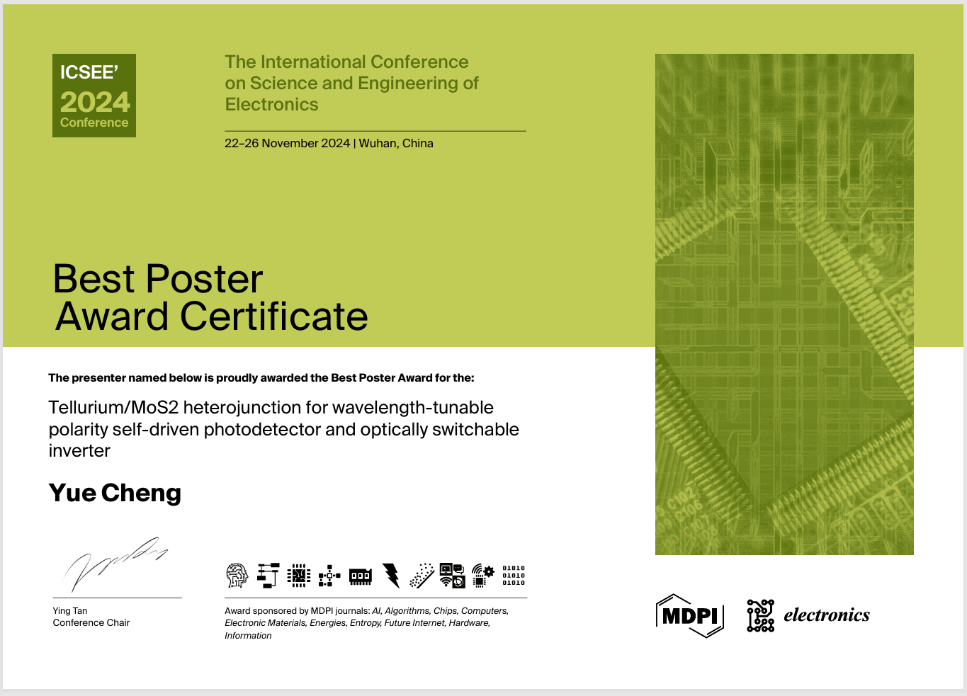 必赢bwin官方网站陶立教授课题组博士研究生程悦参加本次大会并进行了学术海报展示,题目为:“Tellurium/MoS2 heterojunction for wavelength-tunable polarity self-driven photodetector and optically switchable inverter”。该海报受到组织委员会、与会同行学者和国内外专家的一致好评,荣获该会议唯一Best Poster Award(最佳海报论文奖)。该工作利用能带工程,选择新兴的高空穴迁移率二维红外半导体碲单质材料,与二硫化钼构建异质结,在单个光电子器件上实现了波长调控的光响应极性以及光照可切换的反相器功能,促进了集成元件的紧凑性,展示了二维半导体异质结构在光通信及逻辑电路等领域的应用。本次获奖体现了必赢bwin官方网站近年来持续推进“双一流”学科建设和高质量研究生培养,大力支持研究生积极参与国际学术交流等系列举措。