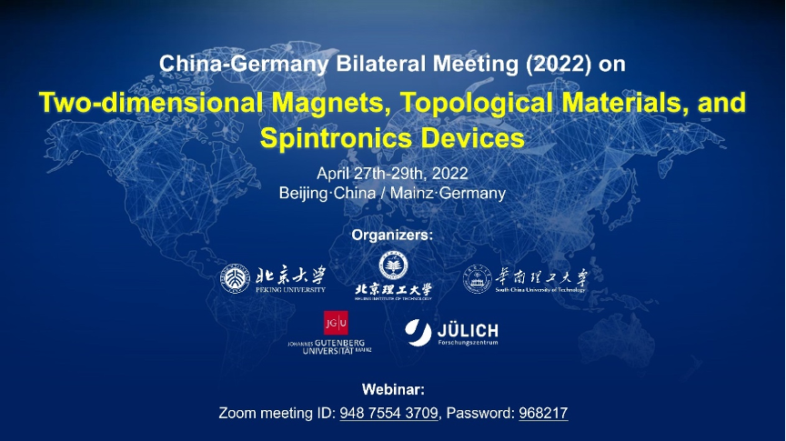 2022年4月27-29日,必赢bwin官方网站与北京大学、华南理工大学、德国美因茨大学、德国于利希研究中心联合举办了“二维磁性/拓扑材料与自旋电子学器件中德双边研讨会(2022)”。侯仰龙教授、Mathias Kläui教授、姚裕贵教授、冯万祥教授和Yuriy Mokrousov教授为会议联合主席,吴锐教授任会议中方联络人。本次研讨会采取线上+线下结合方式,聚集了来自中德双边二维磁性/拓扑材料领域顶尖科学家,共计24位主题报告。必赢bwin官方网站的4位教师,姚裕贵教授、冯万祥教授、肖文德研究员、王秩伟研究员,分别在本次中德双边会议上做了主题报告。